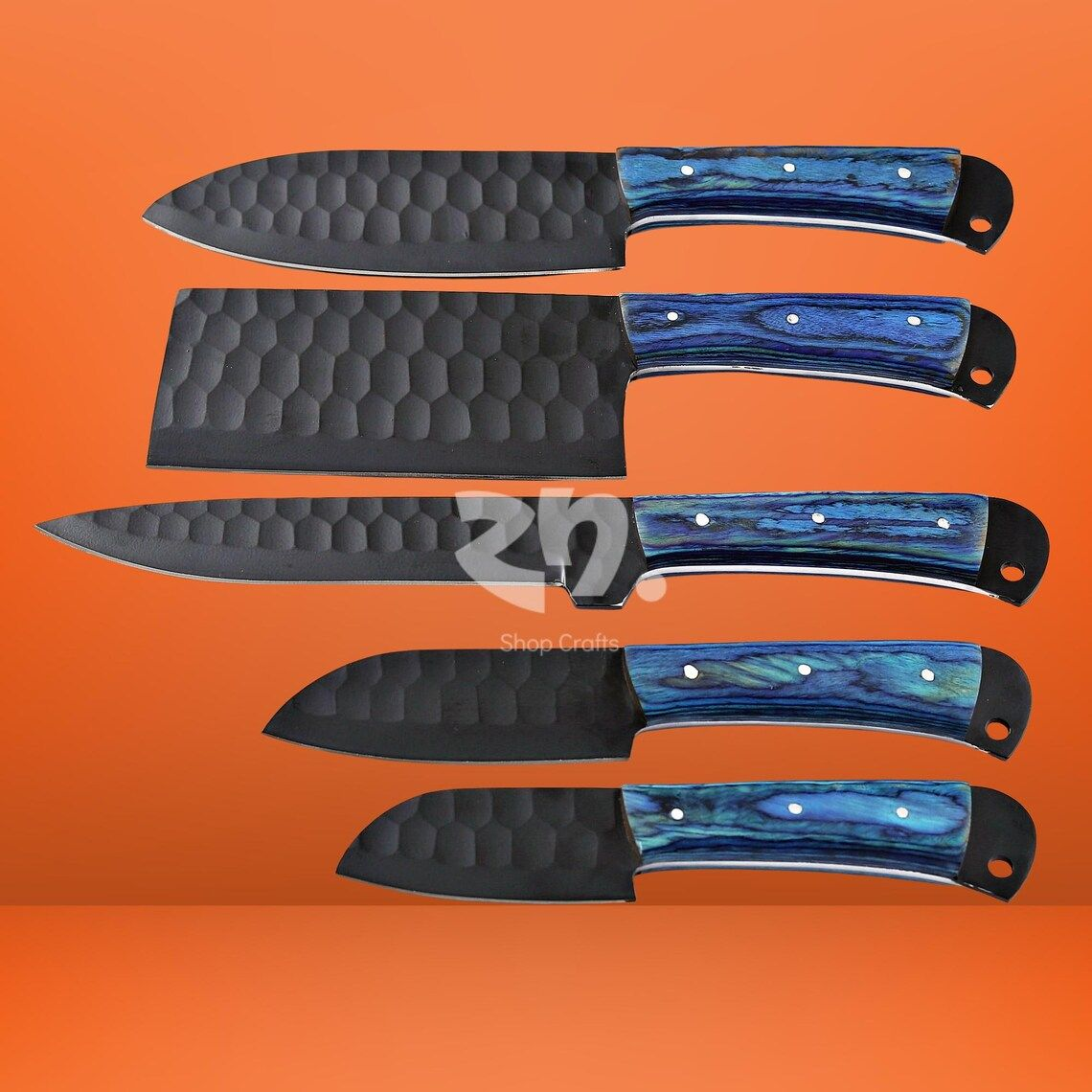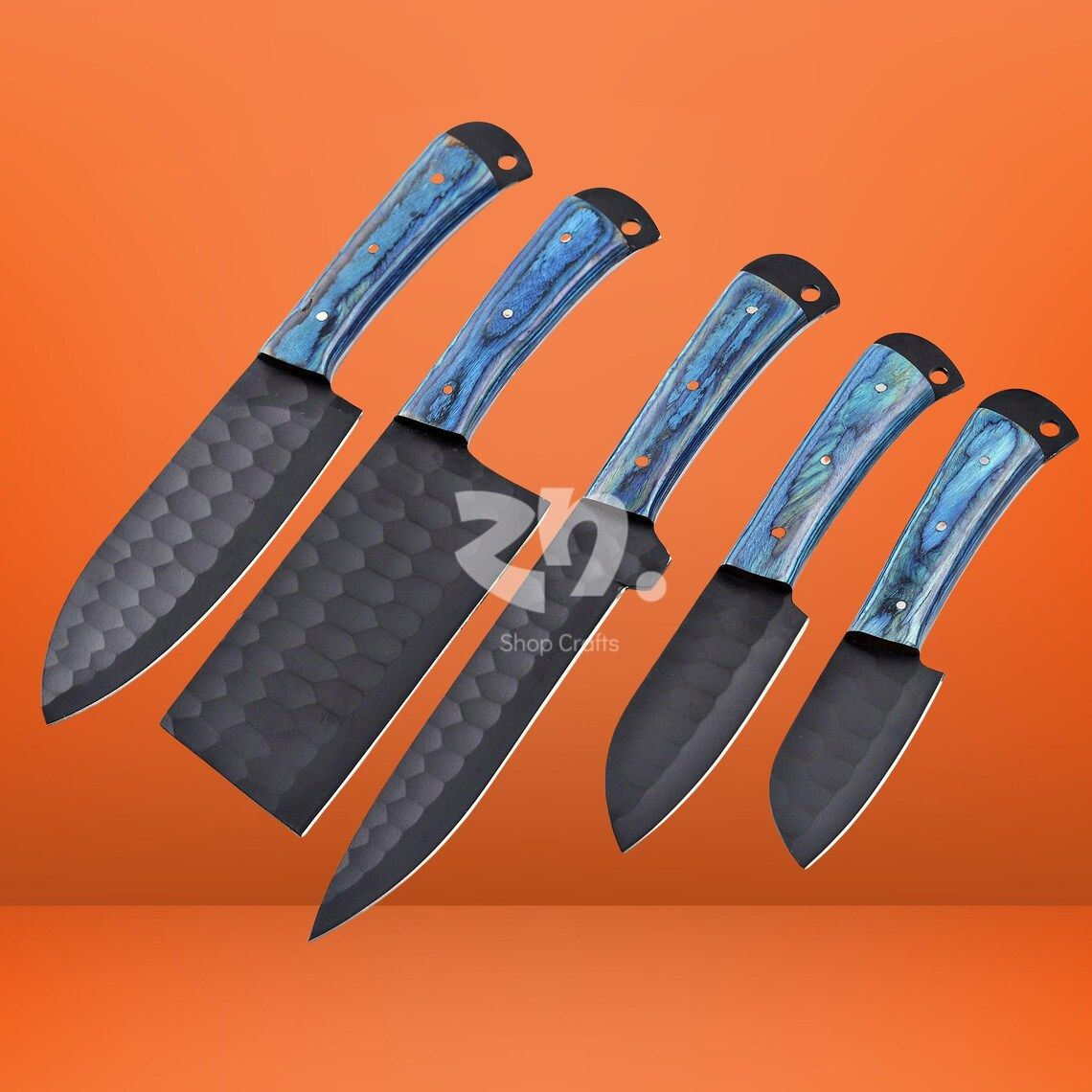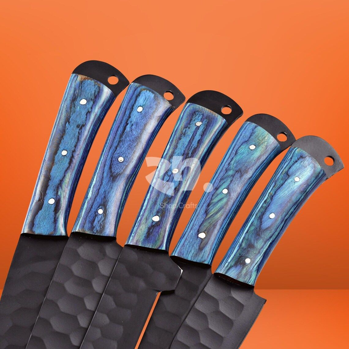 5 Piece Carbon Steel Chef Knife Set with Blue Wooden Handles, Kitchen Knives, BBQ Steak Knives, Ideal Wedding, Anniversary, Birthday Gift, Valentine Day Gift for Him.