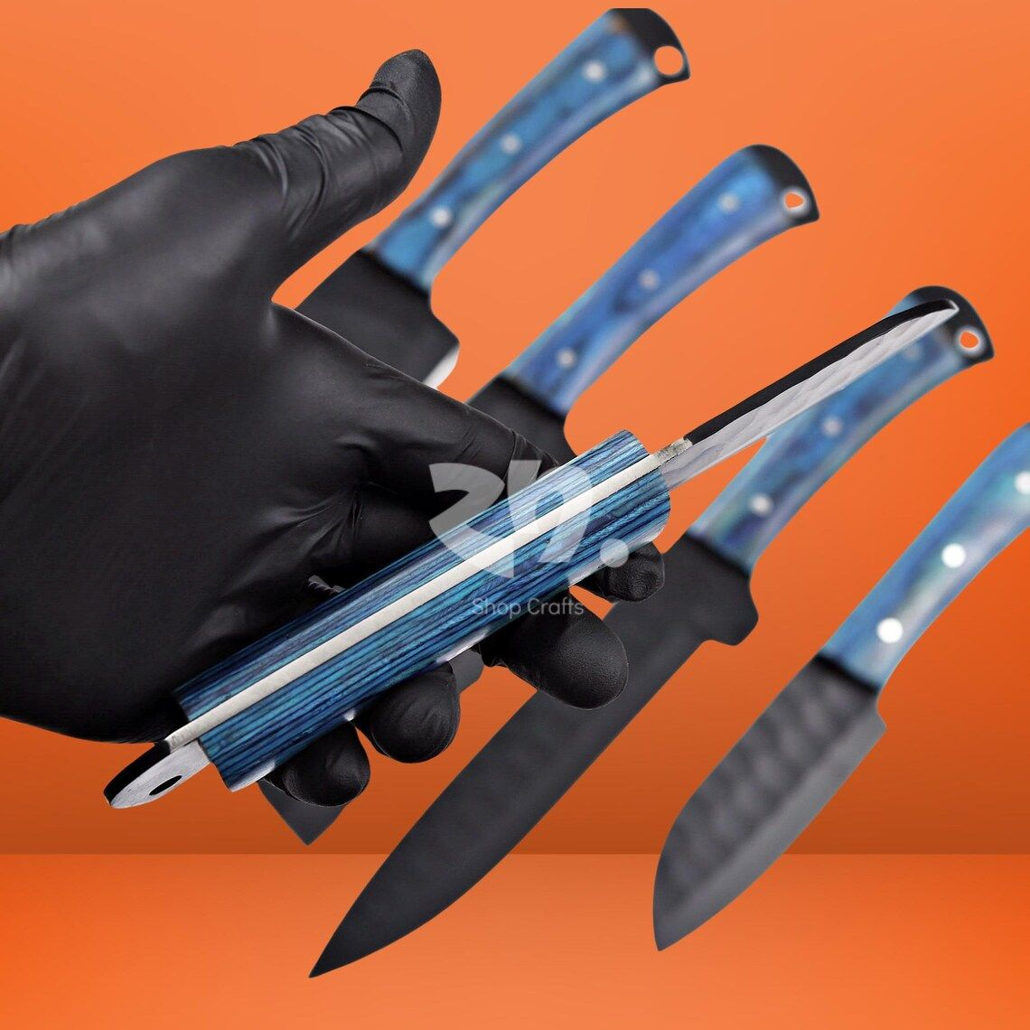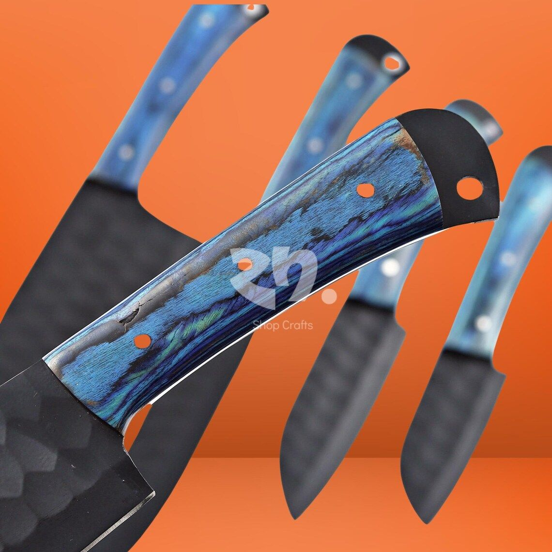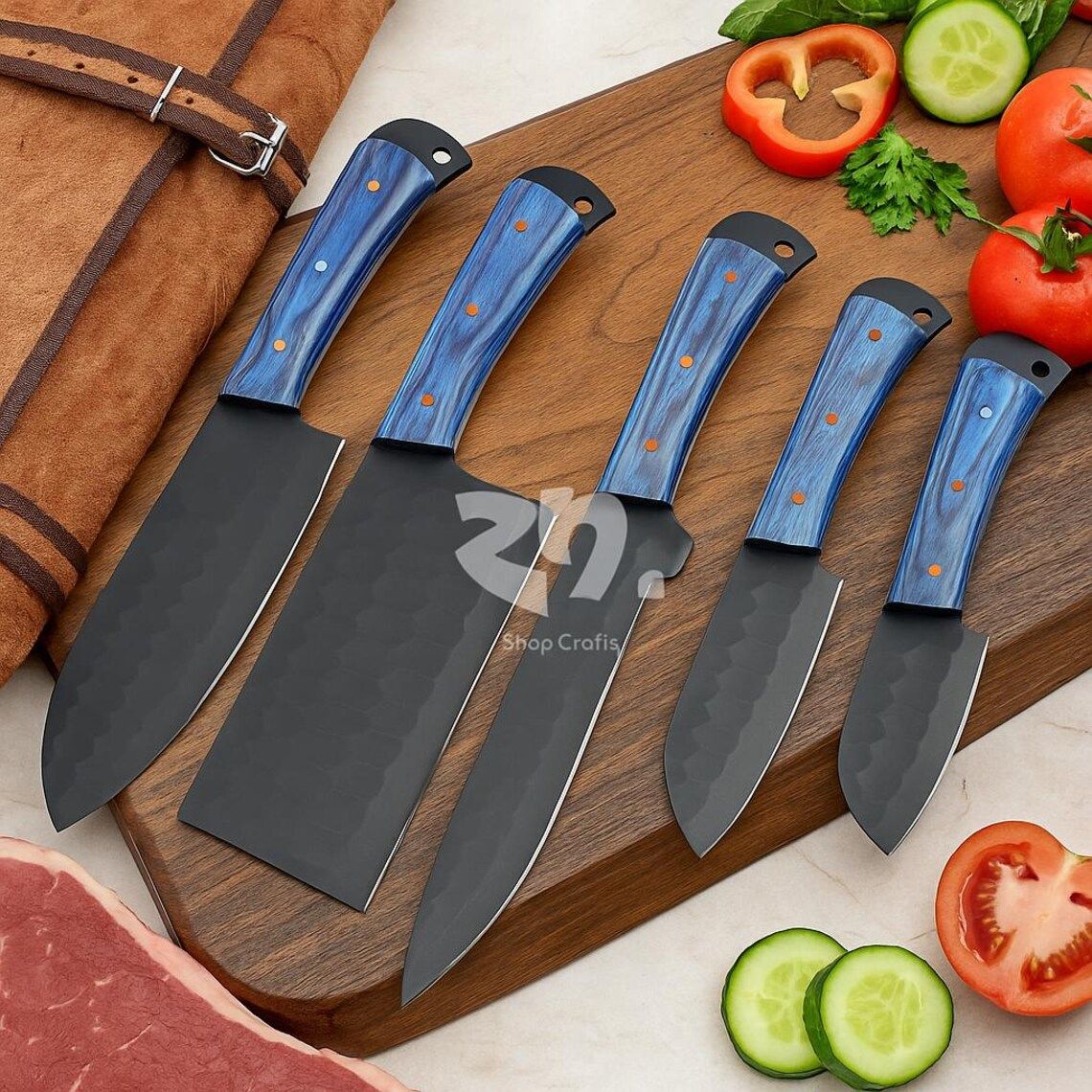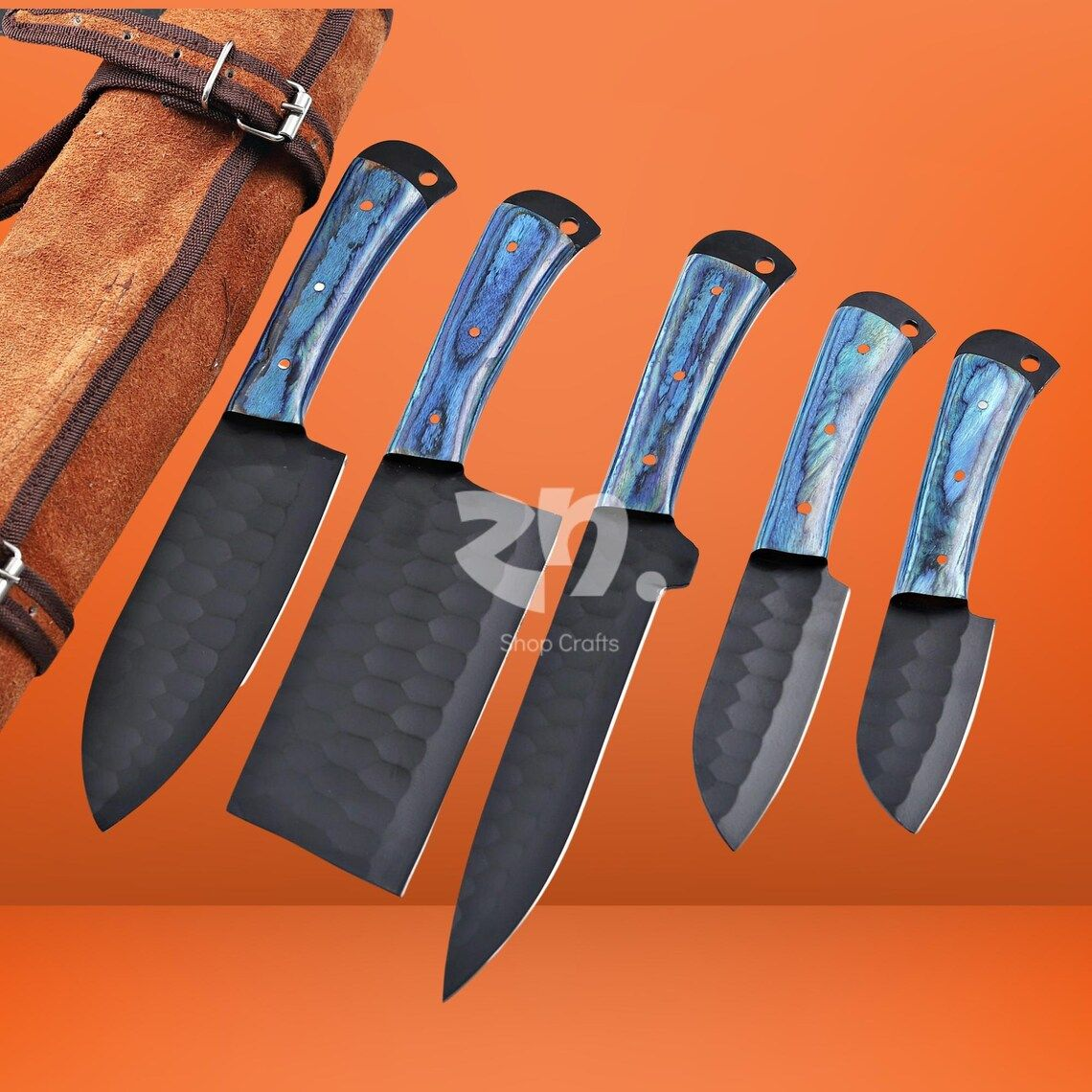5Pcs is a luxurious and high-quality set of handmade kitchen knives, perfect for any home cook or professional chef. Made by ZNShopCrafts, these knives are crafted from blue wooden sheet handles, wood accents, and carbon steel blades that are black powder coated for durability. The set includes a 4.5″ Chef’s Knife, a 6.5″ Chef’s Knife, an 8″ Chef’s Knife, a 9″ Chef’s Knife, and a 6.5″ Vegetable Cleaver, all housed in a premium leather roll bag for easy storage and transport.